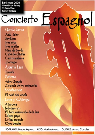 Une guitare virtuose sous les doigts du guitariste et compositeur Arturo Corrales, la voix non moins virtuose, agile et gracieuse de la soprano colorature Fosca Aquaro, et le timbre plus profond et tragique de la magnifique voix de Marta Arranz, serviront la Copla, chanson populaire espagnole des années trente, court poème lyrique populaire ou savant, élégiaque ou amoureux qu’amenèrent de la taverne au théâtre les plus grands poètes : Alberti,Machado , Lorca… et les plus grands compositeurs : Granados, Falla, Leon y Quiroga… Un pur moment de beauté où le grand Fédérico Garcia Lorca sera largement célébré.