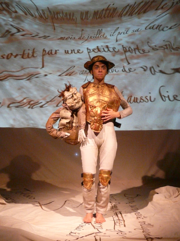 Pour Don Quichotte, les auberges sont des châteaux, les paysannes des princesses, les moulins à vent des géants. Don Quichotte vit dans ce monde virtuel créé par les livres – un clin d’œil à cet imaginaire, qui fait d’ailleurs souvent référence aux chevaliers et qui supplante aujourd’hui la littérature. … Quichotte part, en enfant de cinquante ans, dans le monde réel recouvert du voile de la fiction. Il use d’objets, de marionnettes, de masques et surtout, surtout de jeu pour recréer le décor et les personnages de ses aventures depuis son lit/livre, transformé en champ de bataille. Le jeu de la comédienne Eva Castro et une dizaine de pantins et de marionnettes imaginés par Anne Bothuon nous entraînent dans les affres de cette épopée initiatique, d’une implacable drôlerie.